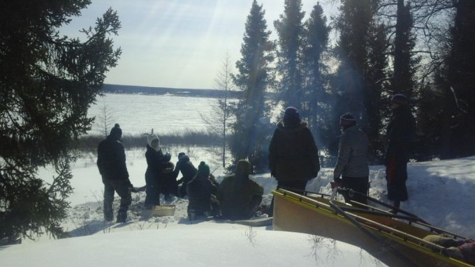 Tel que prévu, mes amis viennent me chercher en motoneige devant chez moi pour midi. Après avoir parcouru quelques kilomètres à travers le village de Kuujjuaq, à travers la forêt et en longeant la rivière Koksoak, nous arrivons au terme de notre voyage. Nous croisons des motoneiges, des adeptes du ski de fond et de raquettes en chemin. Nous laissons les motoneiges sur le chemin pour nous engouffrer en direction de la rivière.... Ouf... la neige est profonde. On s’enfonce jusqu’aux genoux en descendant de la motoneige !