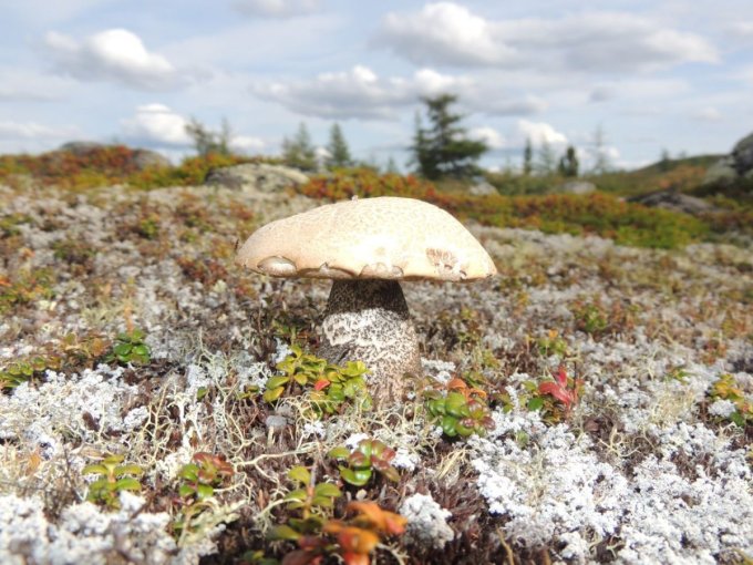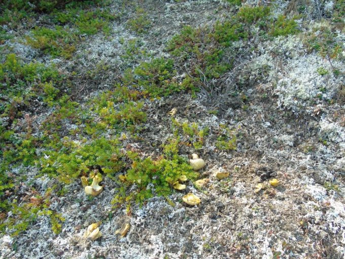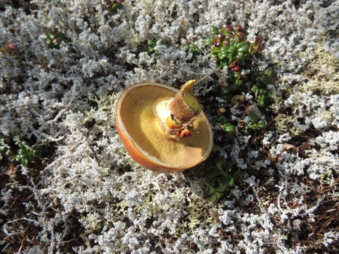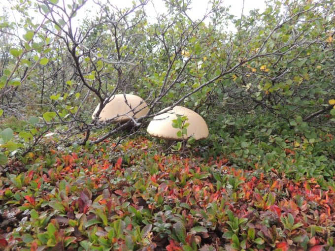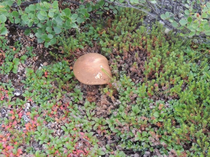 Chacune de nos sorties, nous voyons de nombreux cèpes. Dans la taïga aussi bien que dans la toundra. Il y a du bolet insigne et du Bolet rugueux, du bolet jaune. Pour les autres je n’en suis pas sur. Nous en avons vu certain de taille imposante ! Nous ramassons les meilleurs et nous les mangeons. Ils sont délicieux. Souvent, ils poussent au milieu de bleuets. Nous avons les légumes et le dessert ensemble et même parfois la viande, certains sont pleins de vers.