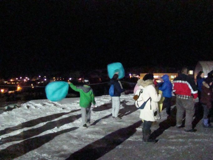 Vers la fin de la soirée tout le monde est invité à aller dehors sur le stationnement. Des ballons sont distribués à ceux qui le souhaitent. Gonflés à l’air chaud, ils sont lancés dans l’atmosphère. Les membres du village mentionnent les noms de ceux qui ont disparu. C’est émouvant.