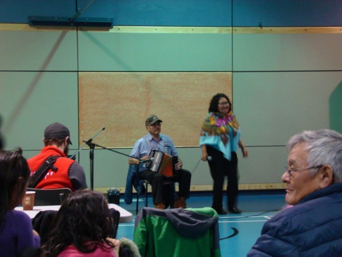 Je participe à deux activités. Dans la semaine un soir, une rencontre dans la salle de musique du village pour jouer du tambour. Nous sommes nombreux. Un beau cercle de tambours se forme. Sous les directives du professionnel, nous jouons. Lorsque deux femmes du groupe commencent à chanter en inuktitut. Elles s’assoient ensemble et font des chants de gorge. Nous les accompagnons aux tambours. C’est magique ! L’une d’elle nous interprète la légende du corbeau et du hibou en chant et en danse.