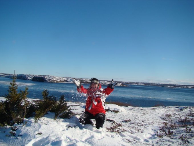 La première belle tempête de neige survient fin octobre. Par une belle journée ensoleillée, nous montons la colline à côté de chez moi. Le paysage est sublime. La glace s’est formée sur la rivière Koksoak. On voit les blocs de glace flotter sur la rivière qui suivent le courant ascendant ou descendant. Je me dis que j’aimerais bien voir à quoi ressemble la baie et la plage à marée basse. Je m’y rends. Splendide ! La marée a formé des blocs de glace au bord de la plage. J’adore le bruit de la glace qui craque au rythme du ressac.