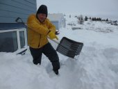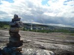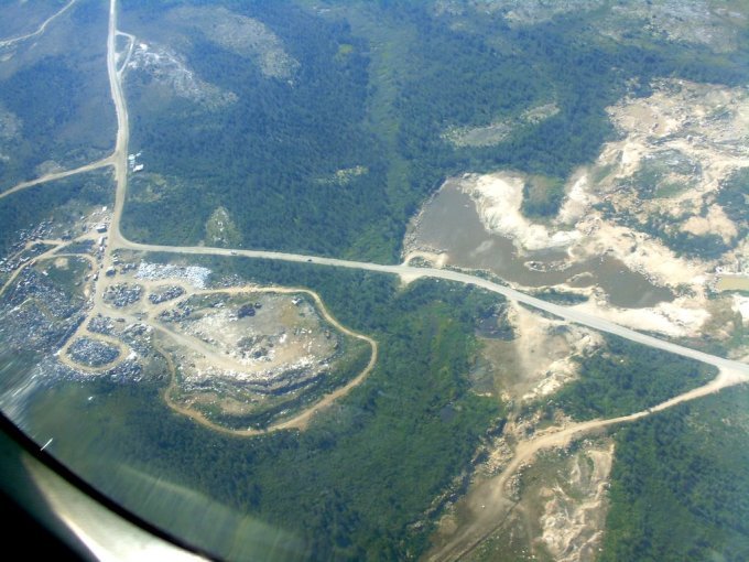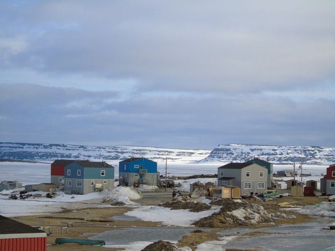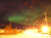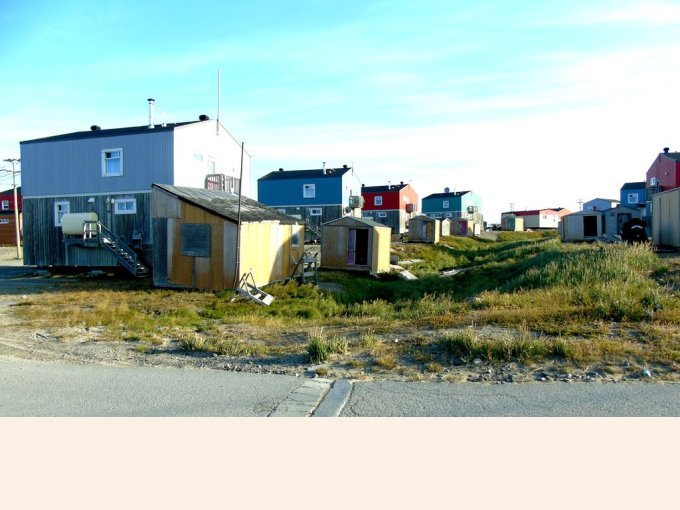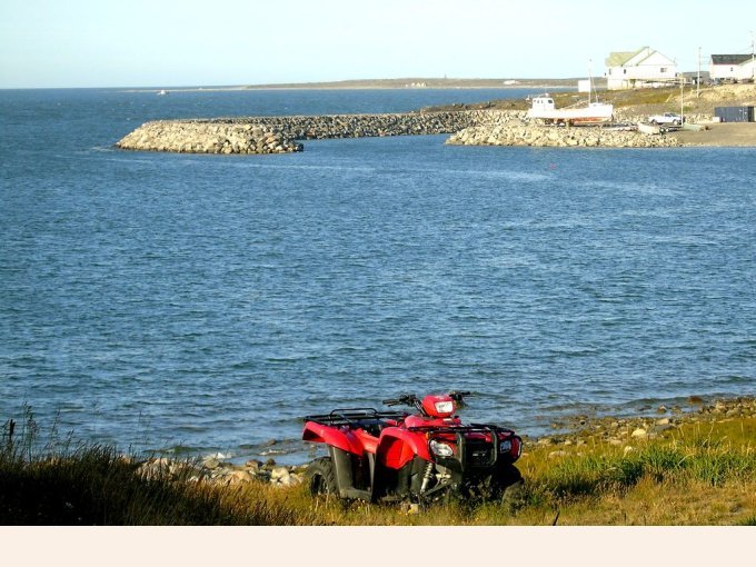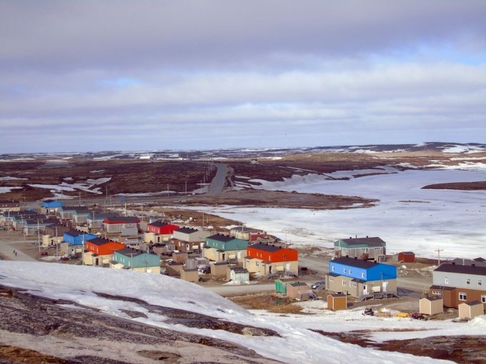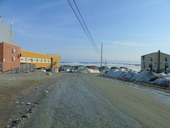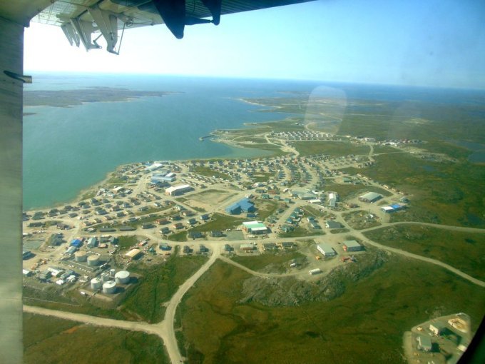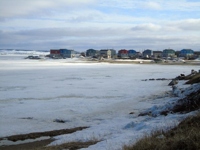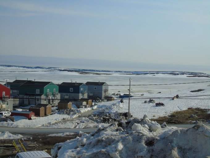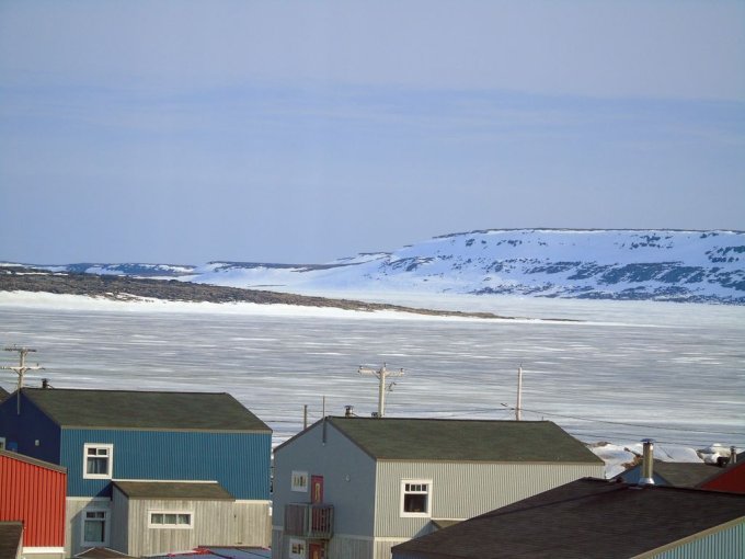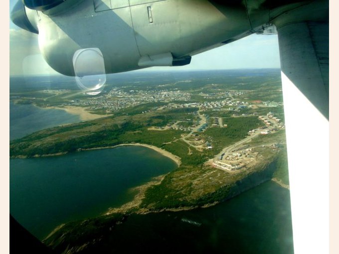 nous longeons le chemin qui rejoint le lieu appelé le plateau, ou se trouve un terrain de golf, qui surplombe la rivière ou s’arrête les bateaux cargos. Je reconnais bien tous ses endroits vu du ciel. Je vois mon logement vue du ciel, le radar et enfin le village de Kuujjuaq puis l’aéroport.